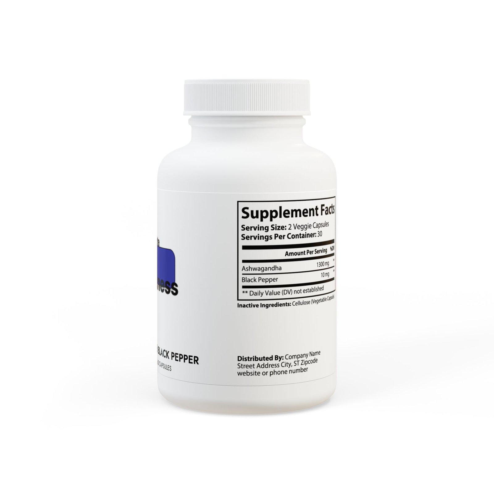 Ingredients: Ashwagandha, Black Pepper. Inactive Ingredients: Cellulose (Vegetable Capsule).