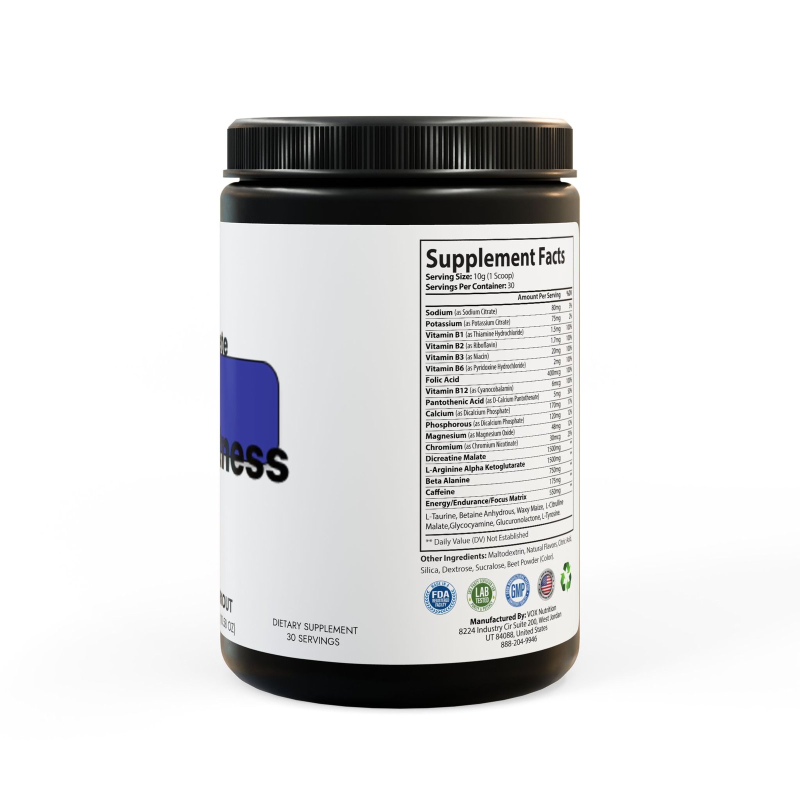 Ingredients: Sodium (as Sodium Citrate), Potassium (as Potassium Citrate), Vitamin B1 (as Thiamine Hydrochloride), Vitamin B2 (as Riboavin), Vitamin B3 (as Niacin), Vitamin B6 (as Pyridoxine Hydrochloride), Folic Acid, Vitamin B12 (as Cyanocobalamin), Pantothenic Acid (as D-Calcium Pantothenate), Calcium (as Dicalcium Phosphate), Phosphorous (as Dicalcium Phosphate), Magnesium (as Magnesium Oxide), Chromium (as Chromium Nicotinate), Dicreatine Malate, L-Arginine Alpha Ketoglutarate, Beta Alanine, Caffeine, L-Taurine, Betaine Anhydrous, Waxy Maize, L-Citrulline, Malate ,Glycocyamine, Glucuronolactone, L-Tyrosine. Other Ingredients: Maltodextrin, Natural Flavors, Citric Acid, Silica, Dextrose, Sucralose, Beet Powder (Color).